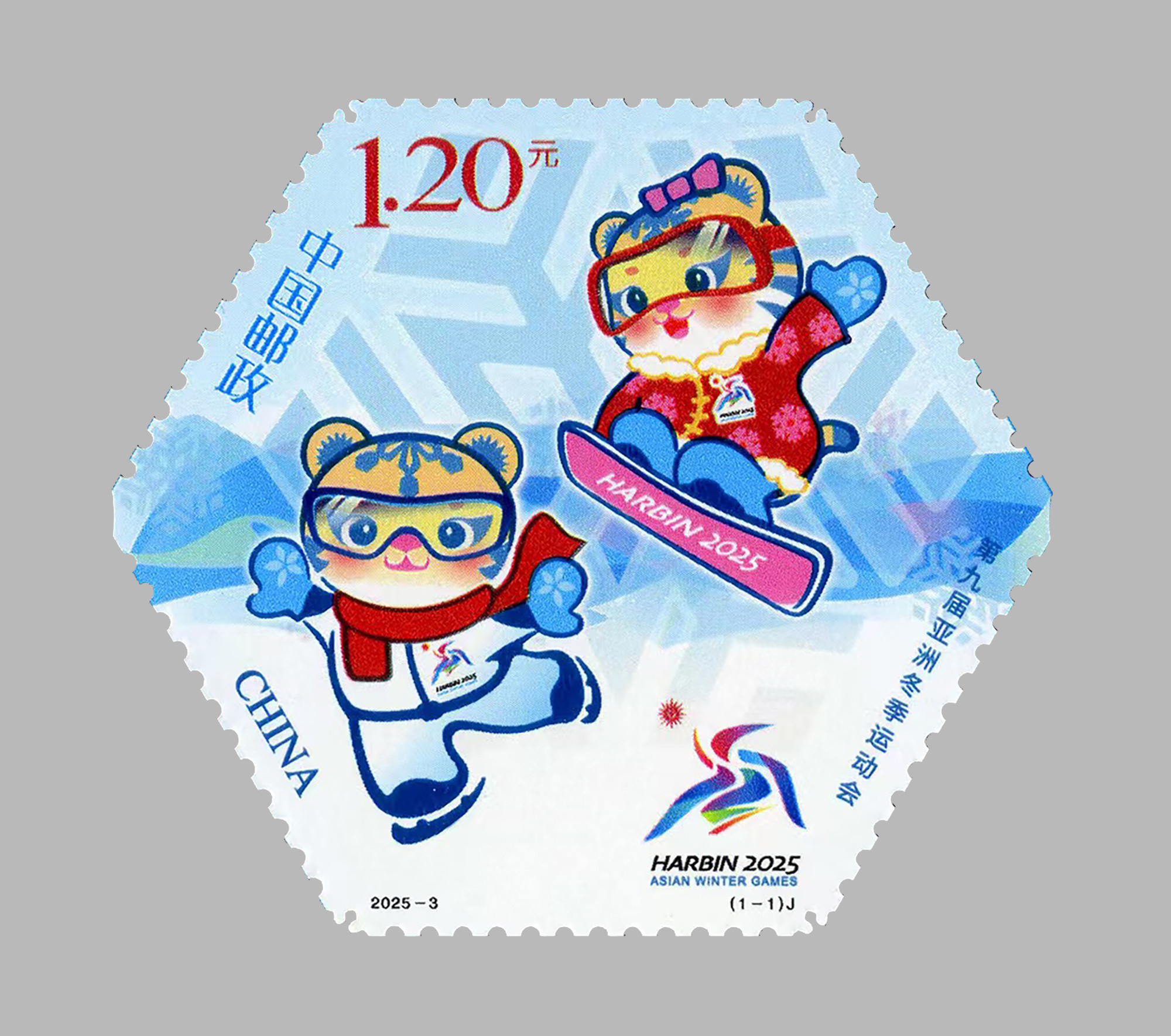 2月7日,中国邮政发行《第九届亚洲冬季运动会》纪念邮票1套1枚。邮票图案名称为:第九届亚洲冬季运动会,面值1.20元。该套邮票采用六边形票幅,以本届亚冬会的吉祥物“滨滨”“妮妮”为画面主体, 辅以会徽及部分核心图形进行表现。